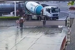 水泥罐车等待栏杆抬起驶入,电瓶车不顾危险依旧“见缝插针”