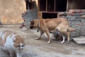 猫拖着铁盘走出来,狗子看到它都要绕道走